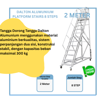 Tangga Dalton Aluminium Platform Stairs 8 Steps 2 Meter dirancang untuk menunjang pekerjaan profesional di area gudang, pabrik, dan industri. Terbuat dari aluminium berkualitas tinggi, tangga ini kuat namun tetap ringan, dilengkapi platform atas yang luas serta roda dorong yang memudahkan mobilitas. Stabil, aman, dan efisien untuk aktivitas kerja di ketinggian rendah hingga menengah.