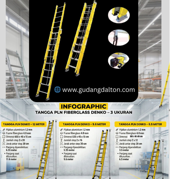 Tangga PLN fiberglass tersedia dalam beberapa ukuran populer yaitu: