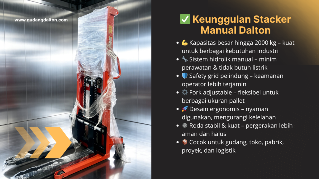 Stacker Manual Dalton WRSD/SYC adalah alat bantu angkat barang yang dirancang khusus untuk mempermudah proses loading, unloading, dan stacking pallet di area gudang maupun industri.