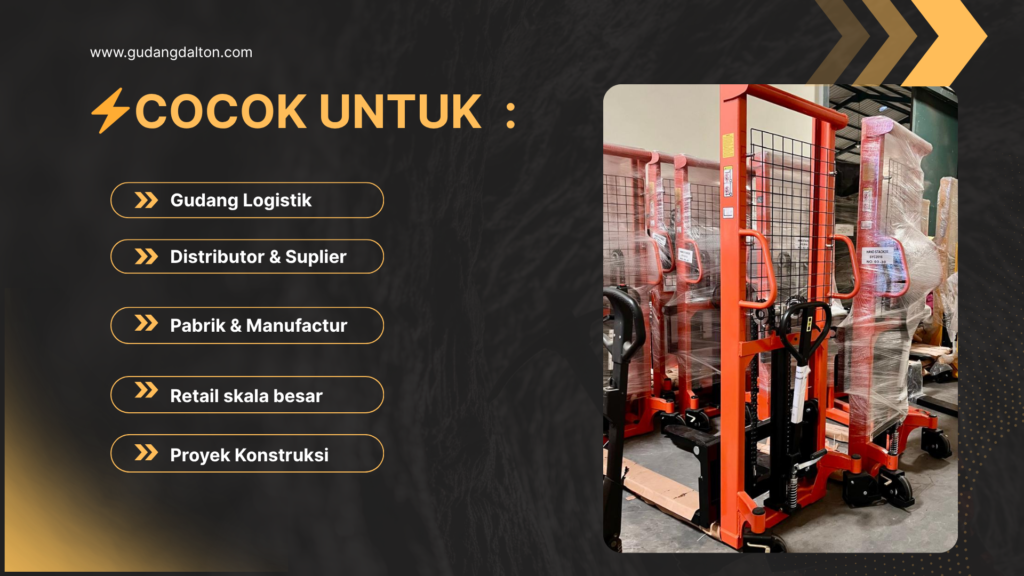 Dirancang untuk bekerja optimal di ruang sempit seperti lorong gudang, kontainer, dan area terbatas, stacker ini sangat cocok untuk bisnis logistik, manufaktur, retail, hingga proyek konstruksi